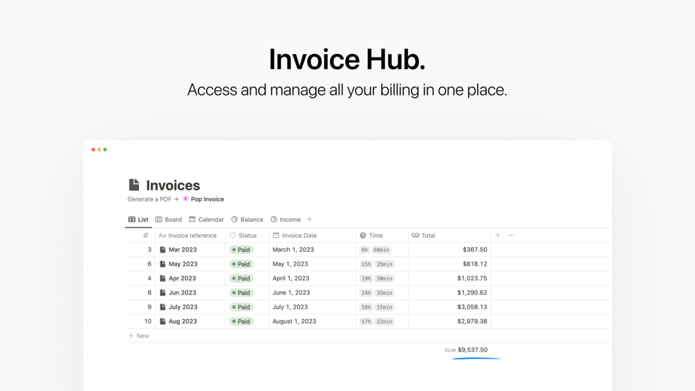 - Generate PDF invoices for your clients. The template is ready for Pop Invoice integration.