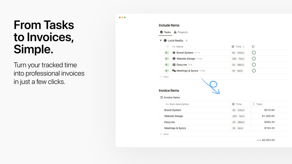 - Create hourly-rated or custom-priced Invoices based on your tasks or projects.